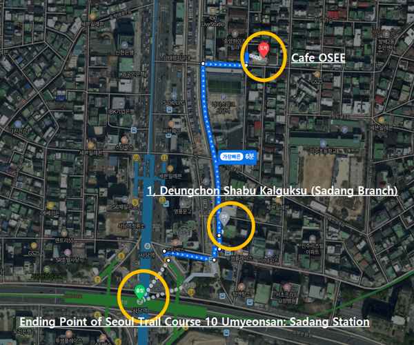✓ After finishing Seoul Trail Course 10 Umyeonsan at Sadang Station, you can reach Deungchon Shabu Kalguksu and Cafe OSEE within a walking distance of about 427 meters, which takes less than 10 minutes.